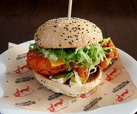 Hand-pressed patty with ranch, pickles, USA cheese, cowboy beef chilli, Buffalo onion rings, & Clem & Franks Carolina reaper sauce