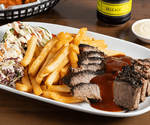 Premium beef brisket rubbed with our secret blend of spices, smoked for 14 hours then mopped with house-made Memphis BBQ sauce. Served with fries, slaw, and cucumber salad