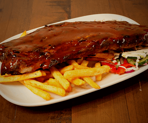 Smoked for 5 hours & finished on the char grilled, mopped in sweet Kansas City style BBQ sauce. Ideal for sticky sweet BBQ lovers; Served with fries, slaw, and cucumber salad