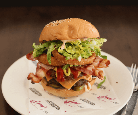 Double beef patties, double cheese, bacon, pickles, onion ring, lettuce ketchup, mustard & mayo.