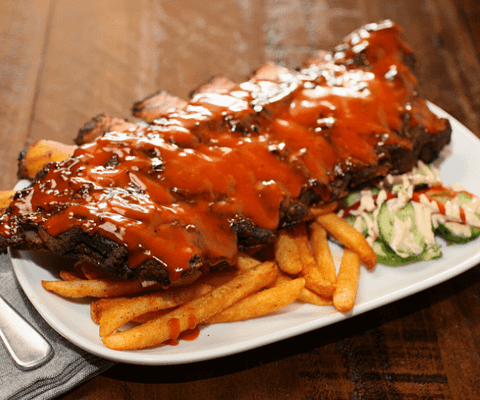 Beef back ribs rubbed & smoked & finished on the char grill & served with Texas BBQ sauce; Served with fries, slaw, and cucumber salad